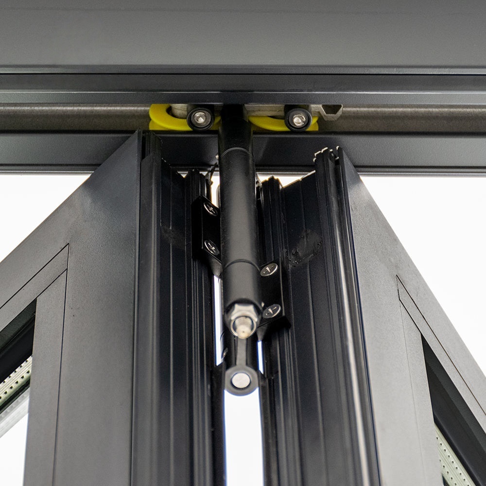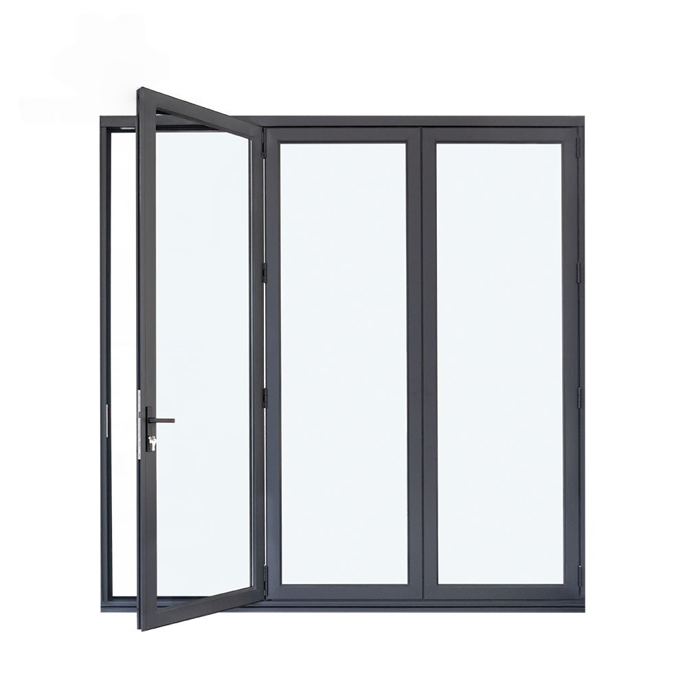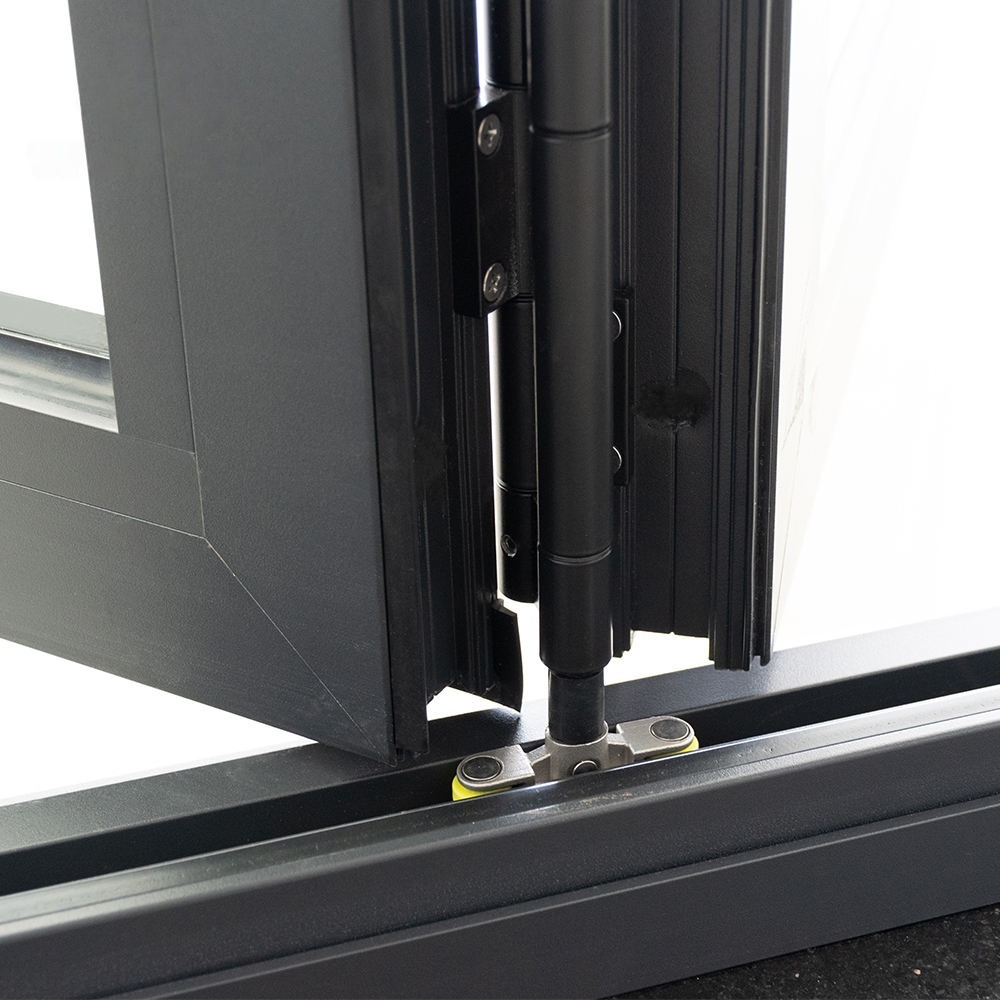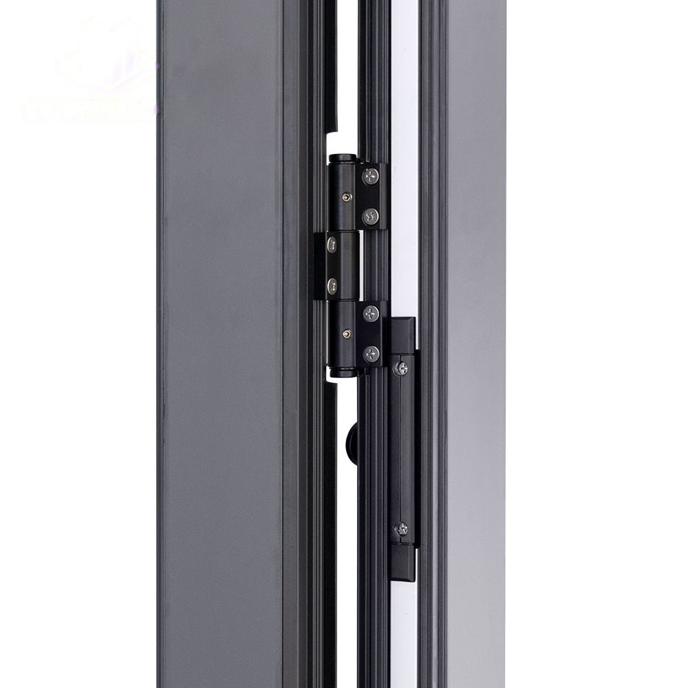 Aluminum bi folding door with grill design put the grill inside double glass, make it good viewing and dust prevention. The folding door frame use heavy duty thermal break profile, so the door are sound and heat insulated. This aluminum folding door series use economical aluminum frame and brand accessory to assembled, so it is very competitive price on the house and factory project.