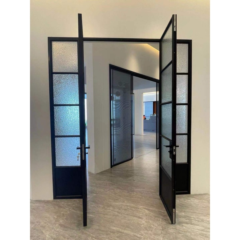 Aluminum bathroom entry doors made by aluminum material assembled frosted glass with flower design inside. The door is waterproof and insulated, the glass all made by tempered glass for safety. Many customers use the door for kitchen bathroom entry door.
