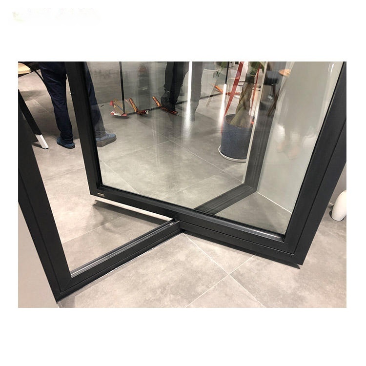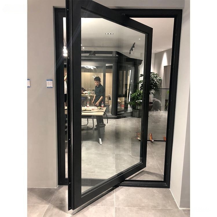 Aluminum pivot door with glass design use strong aluminum frame and double tempered safety glass. Use top and bottom pivot accessory made the door can be both swing inside and outside, even 360 degrees swivel. The door can customized to any size, such as some big size for hotel, villa, market main entrance door.