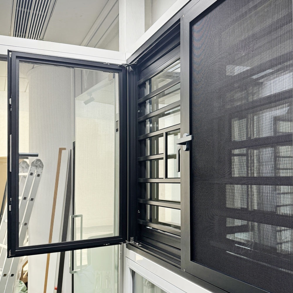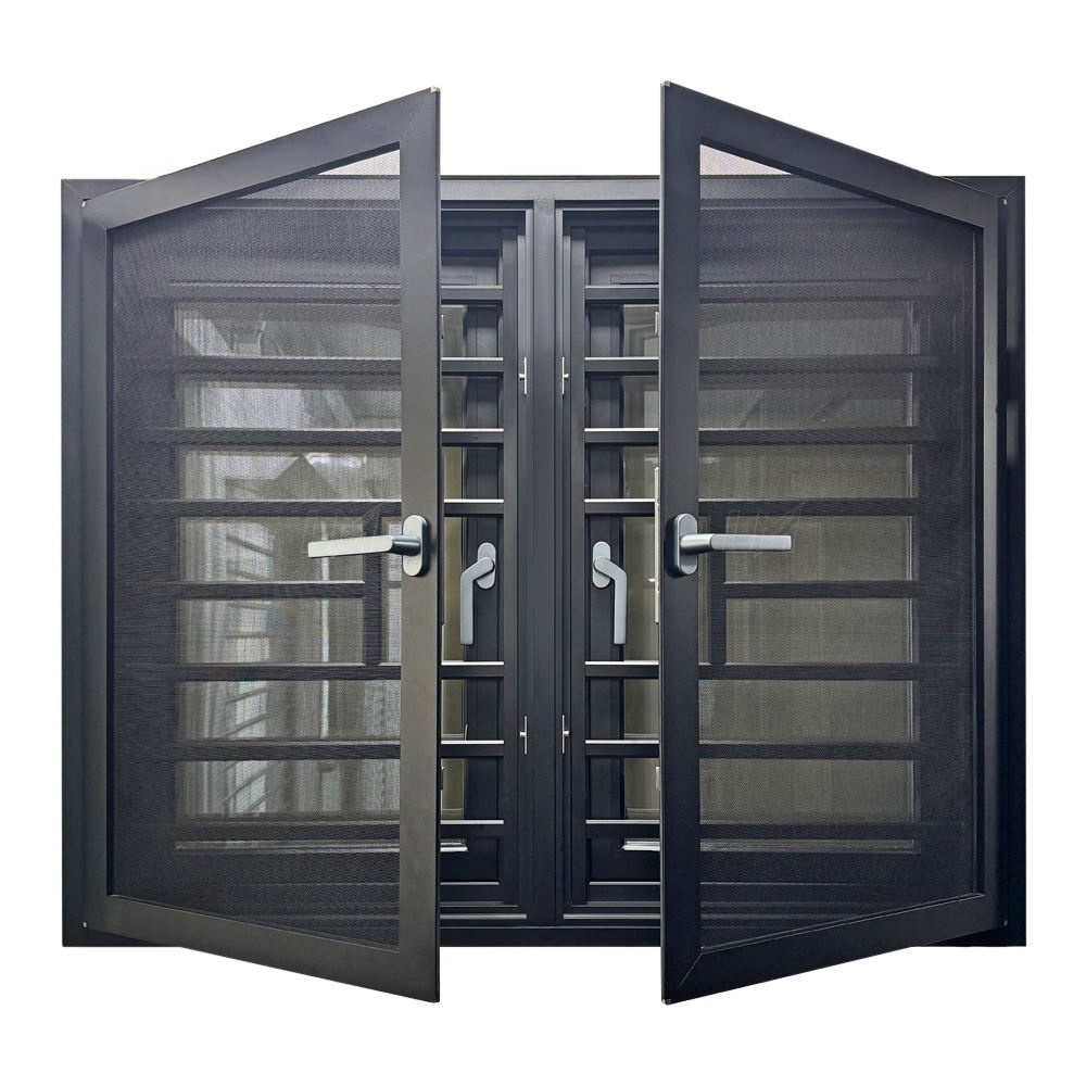Aluminum casement window with grill use black color strong aluminum frame, assembled with double tempered glass with stainless steel grill inside. This design can make the window and window grill integrated one. So customer no need install aluminum windows and window grill separate, they can fixed them together, and the window have both waterproof and burglar proof functions.